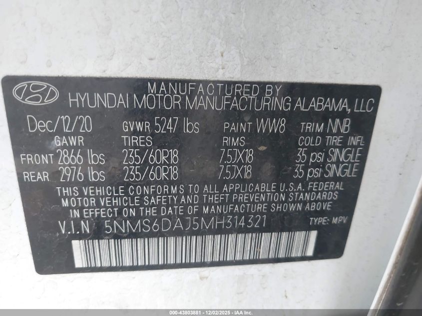 2021 HYUNDAI SANTA FE 2021 року Бензин, 2.5, Повний привід, vin - 5NMS6DAJ5MH314321 з США