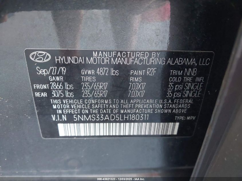 2020 HYUNDAI SANTA FE 2020 року Бензин, 2.4, Передній привід, vin - 5NMS33AD5LH180311 з США