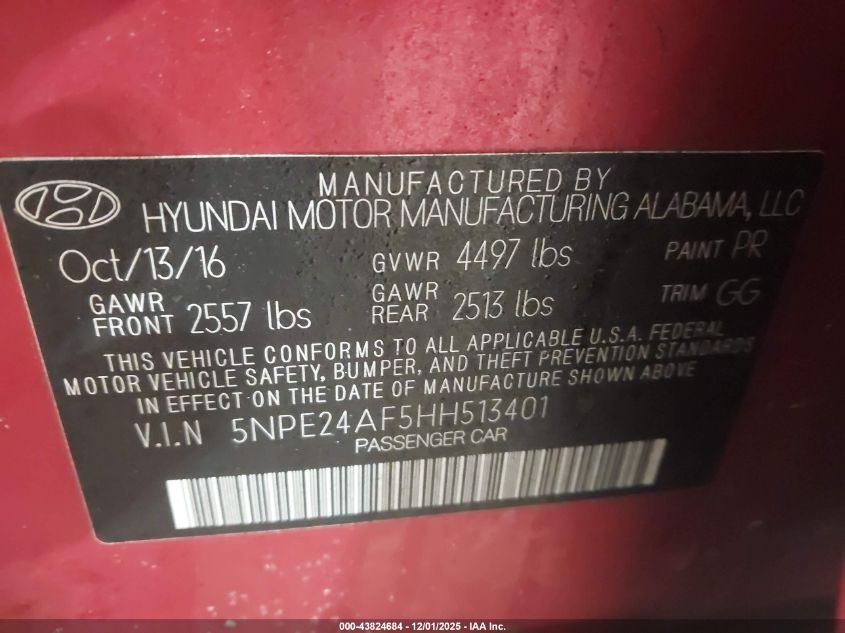 2017 HYUNDAI SONATA 2017 року Бензин, 2.4, Передній привід, vin - 5NPE24AF5HH513401 з США
