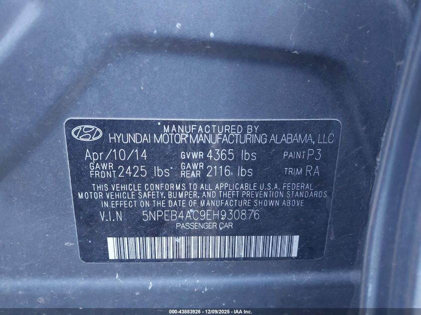 2014 HYUNDAI SONATA 2014 року Бензин, 2.4, Передній привід, vin - 5NPEB4AC9EH930876 з США
