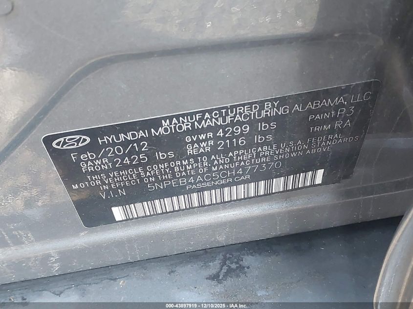 2012 HYUNDAI SONATA 2012 року Бензин, 2.4, Передній привід, vin - 5NPEB4AC5CH477370 з США