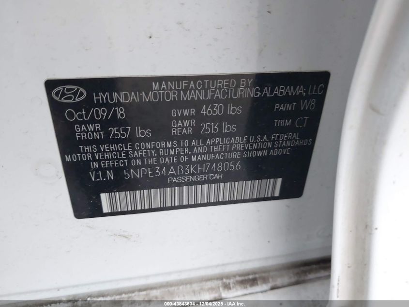 2019 HYUNDAI SONATA 2019 року Бензин, 2.0, Передній привід, vin - 5NPE34AB3KH748056 з США
