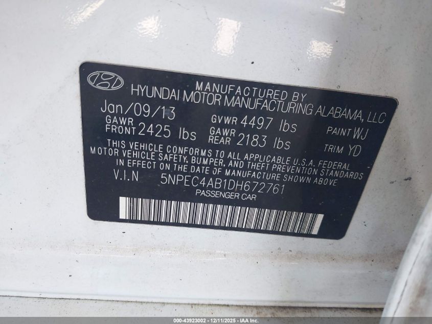 2013 HYUNDAI SONATA 2013 року Бензин, 2.0, Передній привід, vin - 5NPEC4AB1DH672761 з США