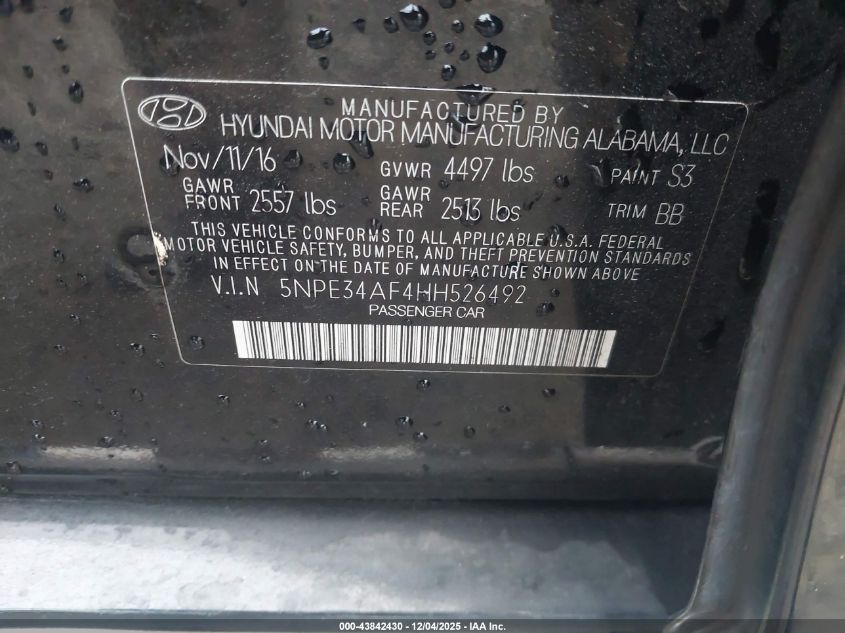 2017 HYUNDAI SONATA 2017 року Бензин, 2.4, Передній привід, vin - 5NPE34AF4HH526492 з США