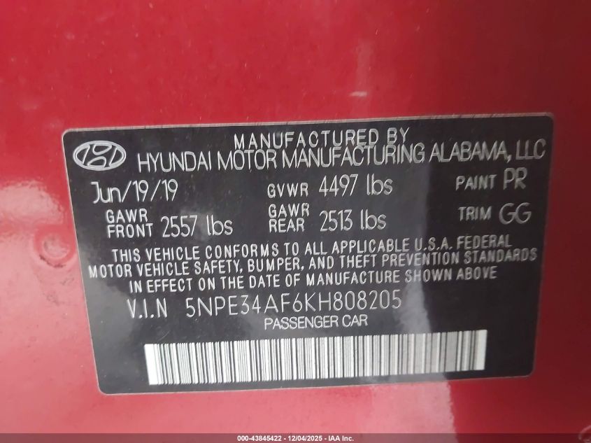 2019 HYUNDAI SONATA 2019 року Бензин, 2.4, Передній привід, vin - 5NPE34AF6KH808205 з США