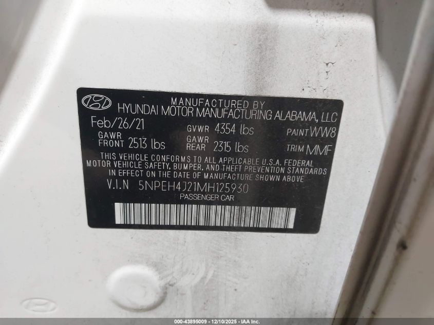 2021 HYUNDAI SONATA 2021 року Бензин, 1.6, Передній привід, vin - 5NPEH4J21MH125930 з США