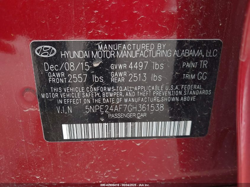 2016 HYUNDAI SONATA 2016 року Бензин, 2.4, Передній привід, vin - 5NPE24AF7GH361538 з США