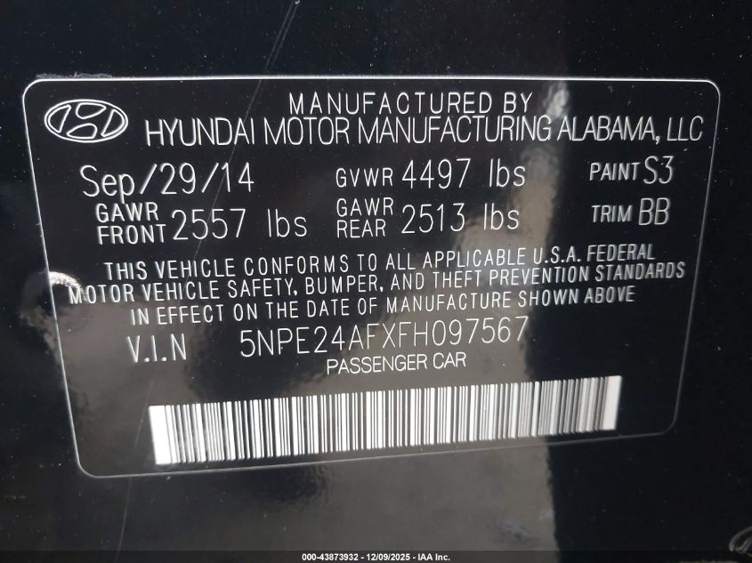 2015 HYUNDAI SONATA 2015 року Бензин, 2.4, Передній привід, vin - 5NPE24AFXFH097567 з США