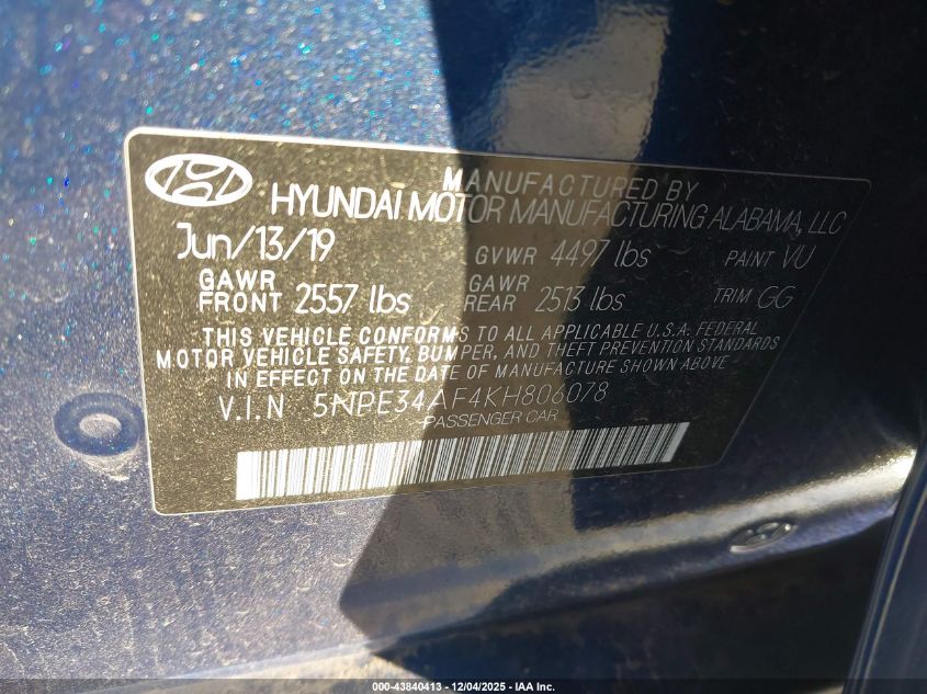 2019 HYUNDAI SONATA 2019 року Бензин, 2.4, Передній привід, vin - 5NPE34AF4KH806078 з США