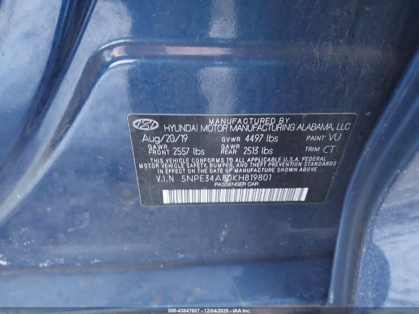 2019 HYUNDAI SONATA 2019 року Бензин, 2.4, Передній привід, vin - 5NPE34AF0KH819801 з США