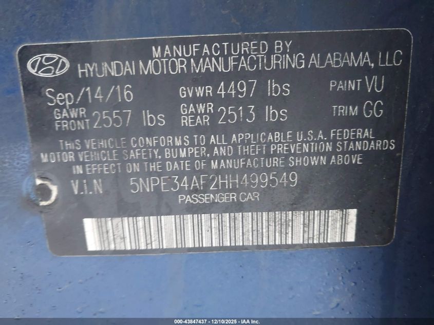 2017 HYUNDAI SONATA 2017 року Бензин, 2.4, Передній привід, vin - 5NPE34AF2HH499549 з США
