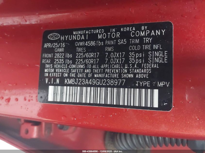 2016 HYUNDAI TUCSON 2016 року Бензин, 2.0, Передній привід, vin - KM8J23A49GU238977 з США