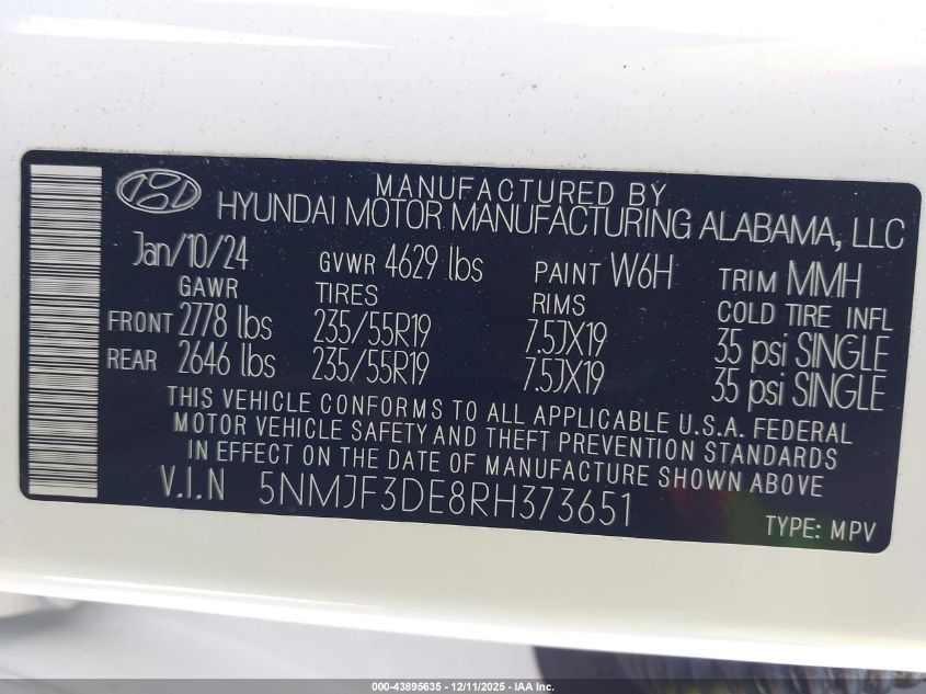 2024 HYUNDAI TUCSON 2024 року Бензин, 2.5, Передній привід, vin - 5NMJF3DE8RH373651 з США