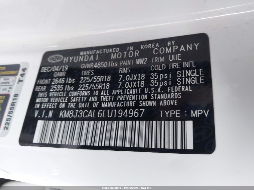 2020 HYUNDAI TUCSON 2020 року Бензин, 2.4, Повний привід, vin - KM8J3CAL6LU194967 з США