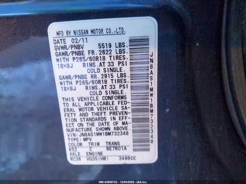 Колір ЧорнийЦиліндри 6Привід Повний привідVIN JN8AS1MW1BM732348Стан Заводиться та їде (перевірено)Ушкодження Передня права AutoRIA