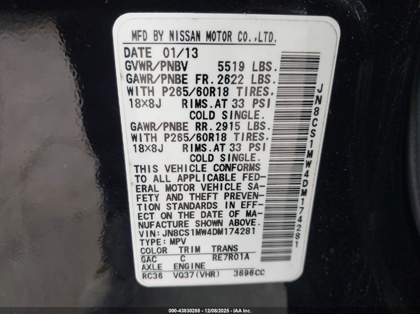 Колір ЧорнийЦиліндри 6Привід Повний привідVIN JN8CS1MW4DM174281Стан Заводиться та їде (перевірено)Ушкодження Передня або задня AutoRIA