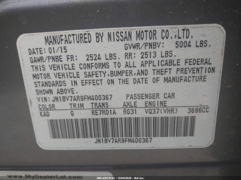 2015 INFINITI Q50 2015 року Бензин, 3.7, Повний привід, vin - JN1BV7AR9FM400367 з США