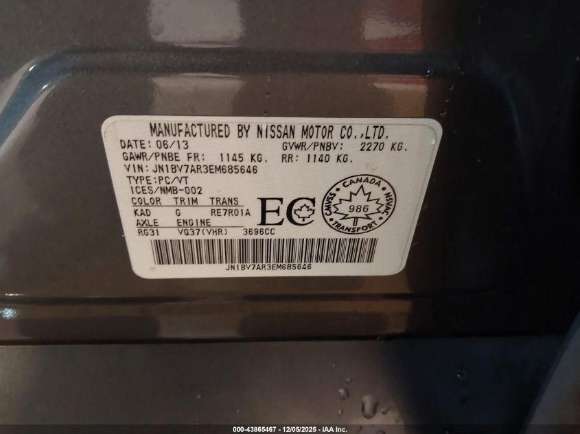 Колір СірийЦиліндри 6Привід Повний привідVIN JN1BV7AR3EM685646Стан СтаціонарноУшкодження Звичайний знос AutoRIA