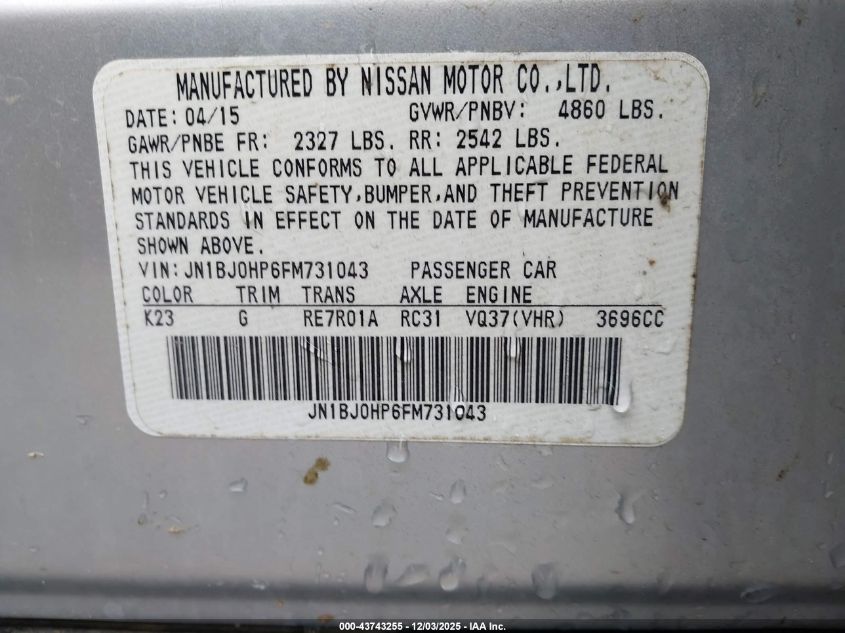 Колір СрібнийЦиліндри 6VIN JN1BJ0HP6FM731043Стан Заводиться та їде (перевірено)Ушкодження Передня або задня AutoRIA