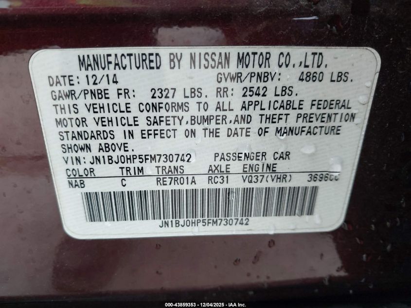 Колір БургундіяЦиліндри 6VIN JN1BJ0HP5FM730742Стан Заводиться та їде (перевірено)Ушкодження Задня ліва AutoRIA