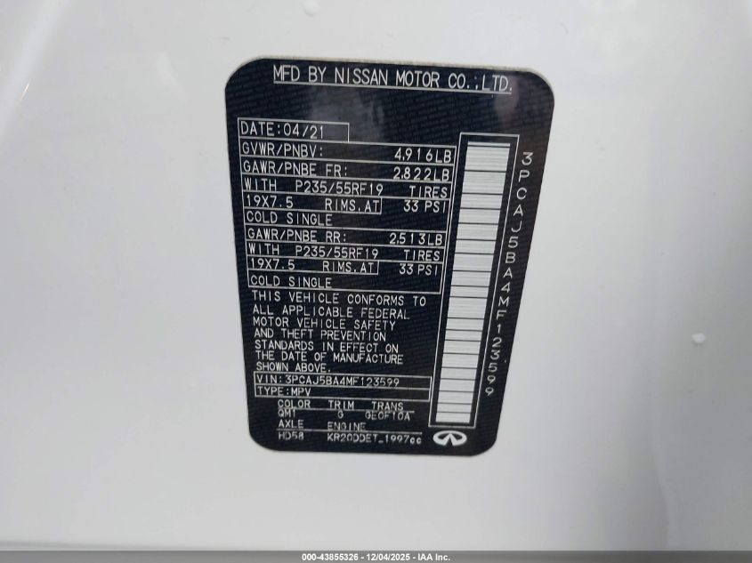 2021 INFINITI QX50 2021 року Бензин, 2.0, Передній привід, vin - 3PCAJ5BA4MF123599 з США