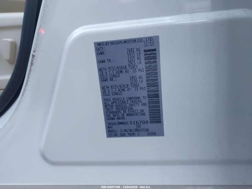 Колір БілийЦиліндри 6Привід Повний привідVIN 5N1AL0MM0EC516708Стан Заводиться та їде (перевірено)Ушкодження Передня ліва AutoRIA