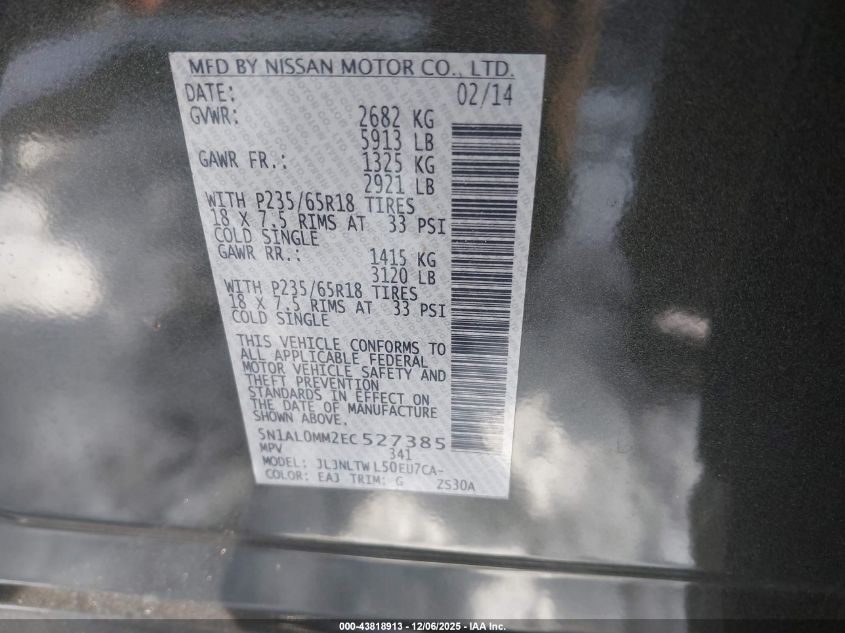 Колір ЧорнийЦиліндри 6Привід Повний привідVIN 5N1AL0MM2EC527385Стан Заводиться та їде (перевірено)Ушкодження Передня або задня AutoRIA