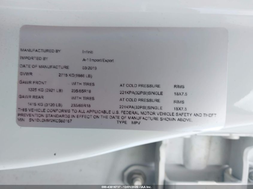 2019 INFINITI QX60 2019 року Бензин, 3.5, Повний привід, vin - 5N1DL0MM2KC560167 з США