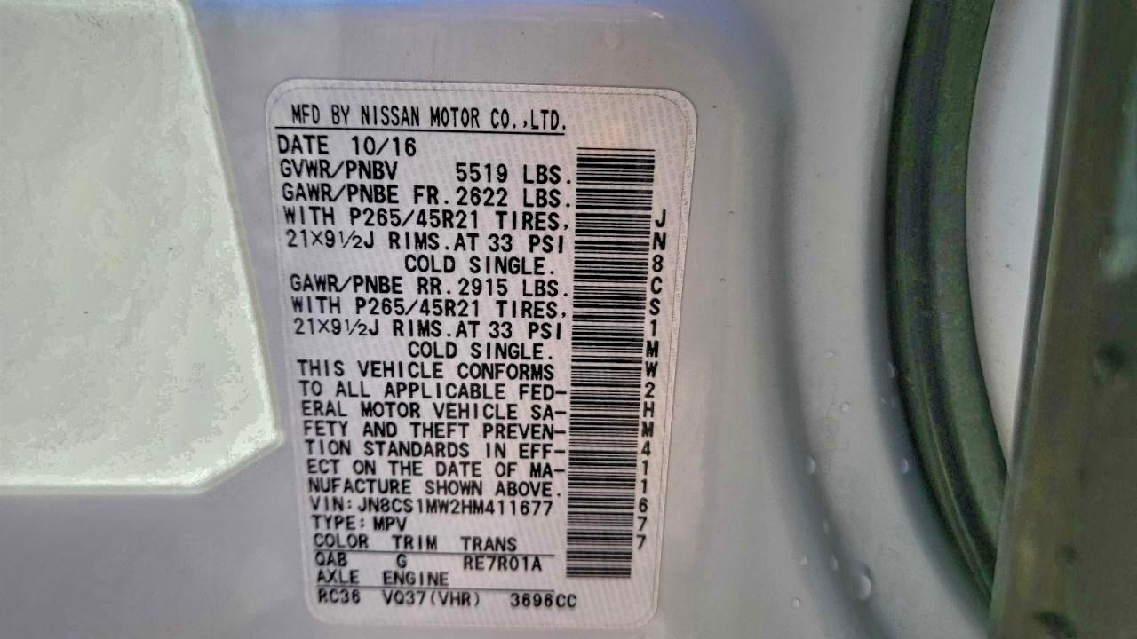 Колір БілийЦиліндри 6Привід Повний привідVIN JN8CS1MW2HM411677Стан Заводиться та їде (перевірено)Ушкодження Звичайний зносДата аукціону 2025-12-08 AutoRIA