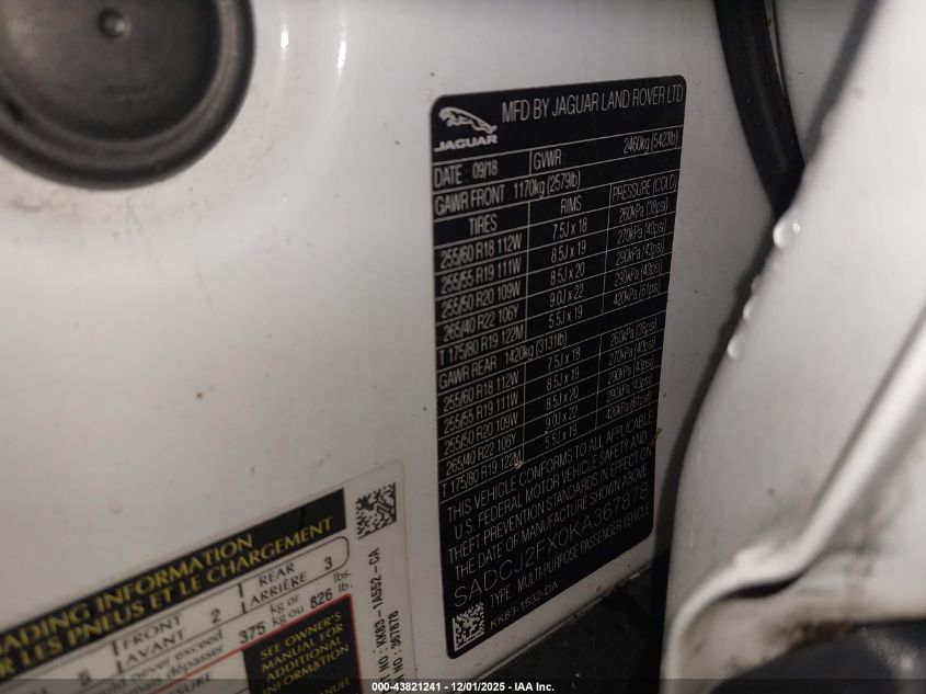 2019 JAGUAR F-PACE 2019 року Бензин, 2.0, Повний привід, vin - SADCJ2FX0KA367878 з США