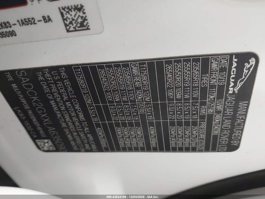 2020 JAGUAR F-PACE 2020 року Бензин, 2.0, Повний привід, vin - SADCK2GXXLA635090 з США