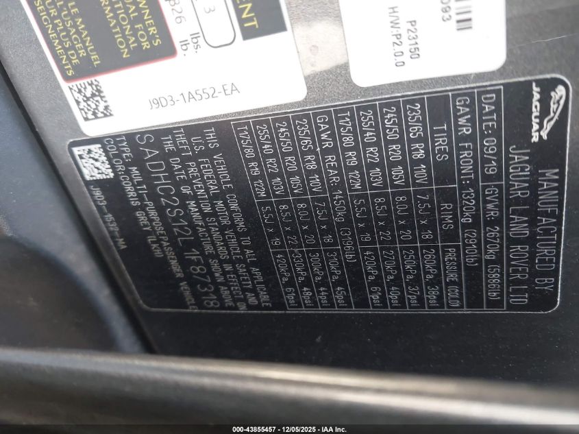 2020 JAGUAR I-PACE 2020 року Електричний, 0.0, Повний привід, vin - SADHC2S12L1F87318 з США