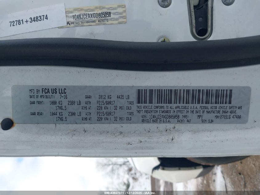 2016 JEEP COMPASS 2016 року Бензин, 2.0, Передній привід, vin - 1C4NJCEAXGD805058 з США