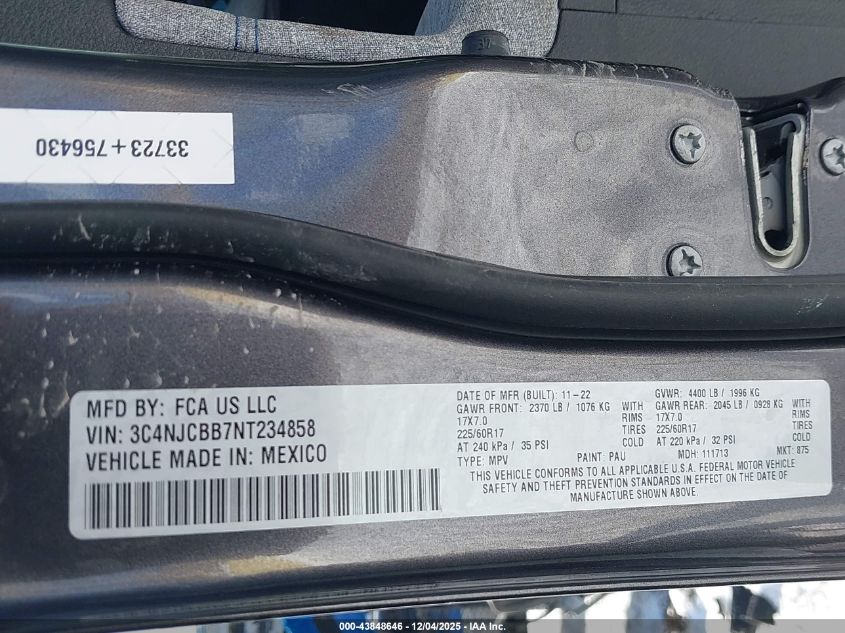 Колір СірийЦиліндри 4Привід Передній привідVIN 3C4NJCBB7NT234858Стан СтаціонарноУшкодження Передня або задня AutoRIA