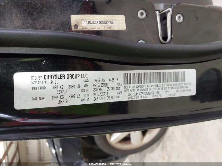 Колір ЧорнийЦиліндри 4Привід Передній привідVIN 1C4NJCCB4CD542054Стан Заводиться та їде (перевірено)Ушкодження Звичайний зносДата аукціону 2025-12-18 AutoRIA