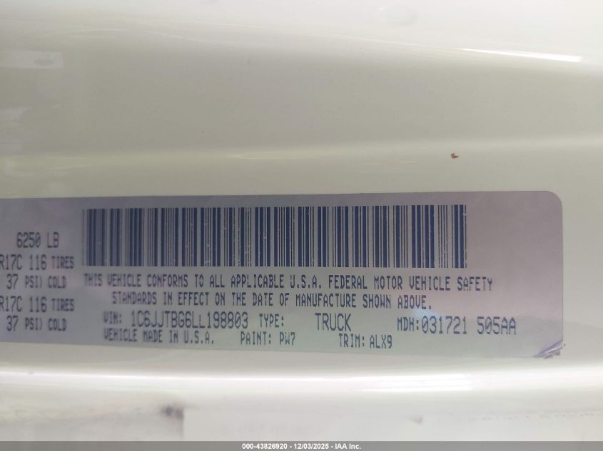 2020 JEEP GLADIATOR 2020 року Бензин, 3.6, Повний привід, vin - 1C6JJTBG6LL198803 з США