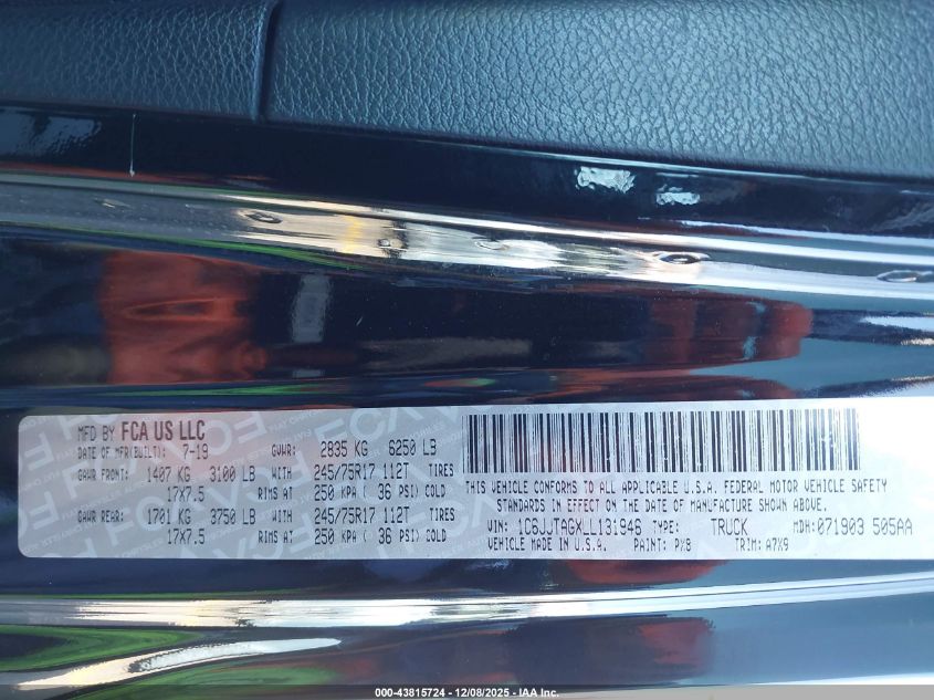 Колір ЧорнийЦиліндри 6Привід Повний привідVIN 1C6JJTAGXLL131946Стан ЗаводитьсяУшкодження Права сторона AutoRIA