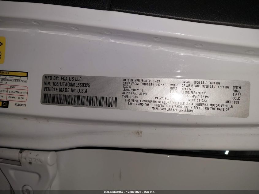 2021 JEEP GLADIATOR 2021 року Бензин, 3.6, Повний привід, vin - 1C6HJTAG8ML560325 з США