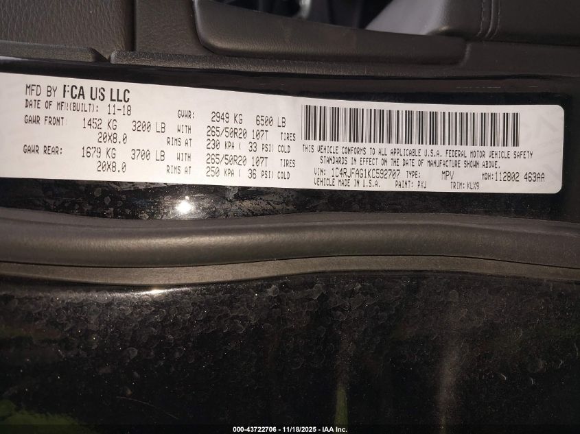 Колір ЧорнийЦиліндри 6Привід Повний привідVIN 1C4RJFAG1KC592707Стан Заводиться та їде (перевірено)Ушкодження Передня або задня AutoRIA