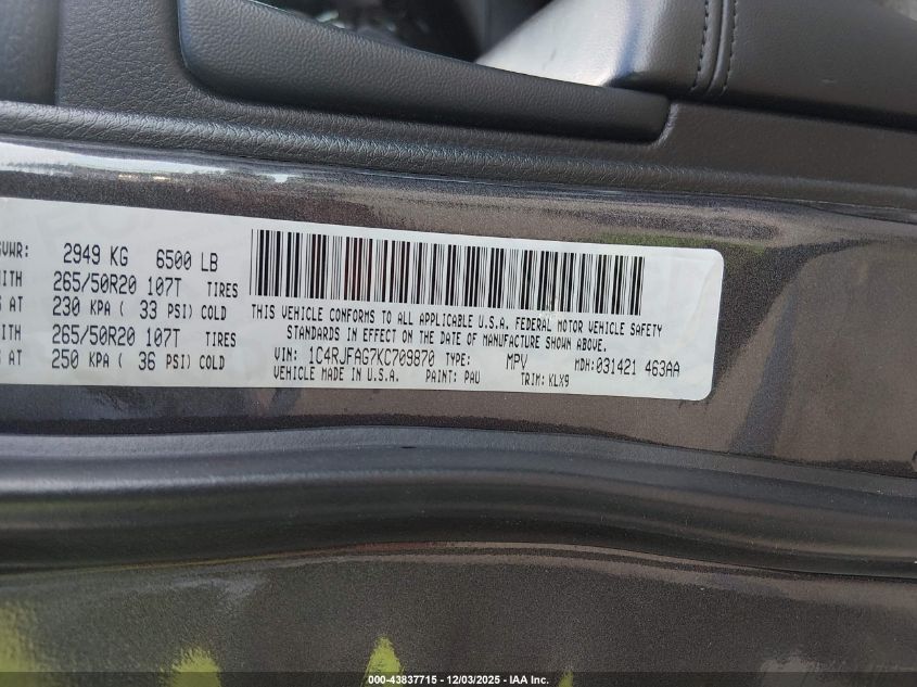 2019 JEEP GRAND CHEROKEE 2019 року Бензин, 3.6, Повний привід, vin - 1C4RJFAG7KC709870 з США