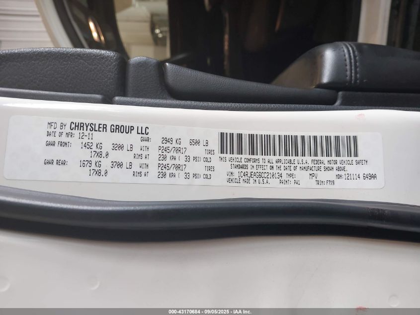 Колір БілийЦиліндри 6VIN 1C4RJEAG6CC210134Стан Заводиться та їде (перевірено)Ушкодження Задня ліваДата аукціону 2025-12-11 AutoRIA