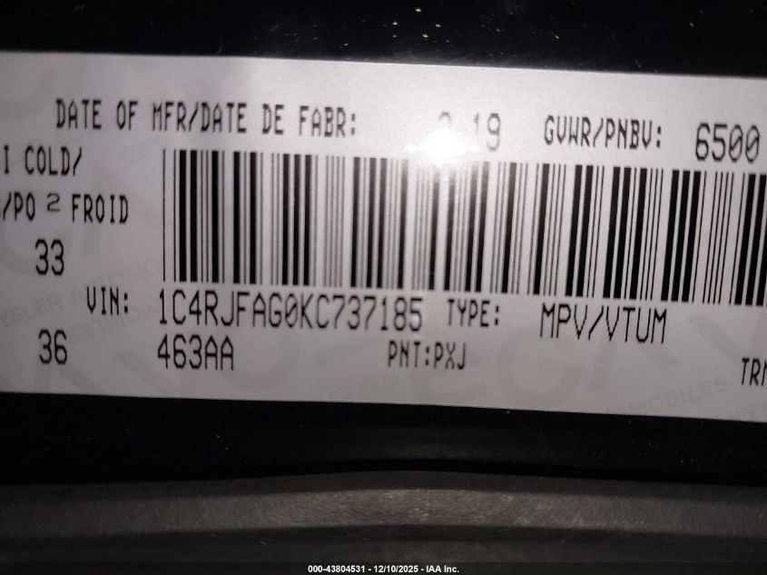 2019 JEEP GRAND CHEROKEE 2019 року Бензин, 3.6, Повний привід, vin - 1C4RJFAG0KC737185 з США