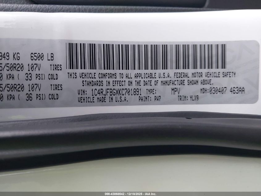 Колір БілийЦиліндри 6Привід Повний привідVIN 1C4RJFBGXKC701891Стан Заводиться та їде (перевірено)Ушкодження Передня ліва AutoRIA