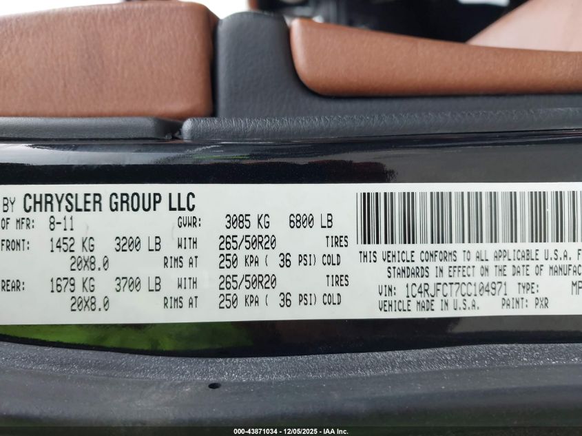 2012 JEEP GRAND CHEROKEE 2012 року Бензин, 5.7, Повний привід, vin - 1C4RJFCT7CC104971 з США