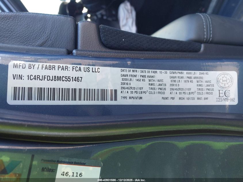2021 JEEP GRAND CHEROKEE 2021 року Бензин, 6.4, Повний привід, vin - 1C4RJFDJ8MC551467 з США
