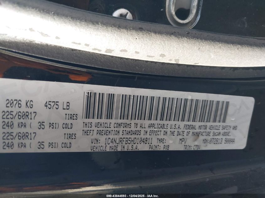 Колір ЧорнийЦиліндри 4Привід Повний привідVIN 1C4NJRFB5HD104911Стан СтаціонарноУшкодження Передня або задня