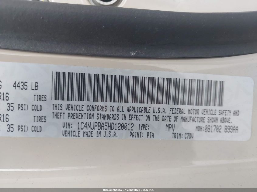 Колір БежевийЦиліндри 4Привід Передній привідVIN 1C4NJPBA5HD120012Стан Заводиться та їде (перевірено)Ушкодження З боків