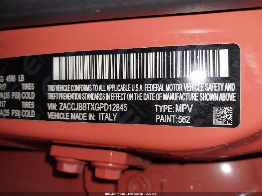 Колір АпельсиновийЦиліндри 4Привід Повний привідVIN ZACCJBBTXGPD12845Стан СтаціонарноУшкодження Передня або задня AutoRIA