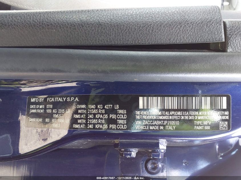 Колір Циліндри 4Привід Передній привідVIN ZACCJABH7JPJ10510Стан НевідомоУшкодження Невідомо AutoRIA