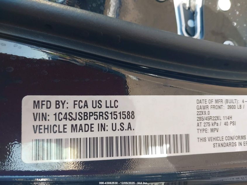 Колір ЧорнийЦиліндри 6Привід Повний привідVIN 1C4SJSBP5RS151588Стан Заводиться та їде (перевірено)Ушкодження Передня права
